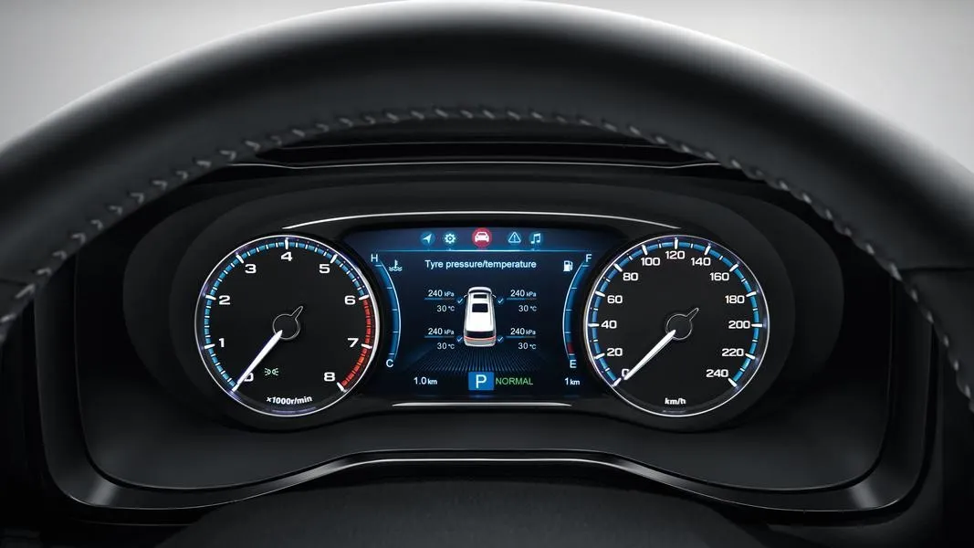 На рабочем месте водителя находятся четырехспицевый многофункциональный руль и образцово-показательная комбинация приборов с парой аналоговых циферблатов и вписанным между ними 7-дюймовым цветным «окошком» борткомпьютера. Основательную переднюю панель по центру украшают 10.1-дюймовый тачскрин медиацентра, «окруженный» вентиляционными дефлекторами, под которым сгруппированы два кнопочных блока: верхний управляет развлекательными возможностями, а нижний – климатическими функциями.